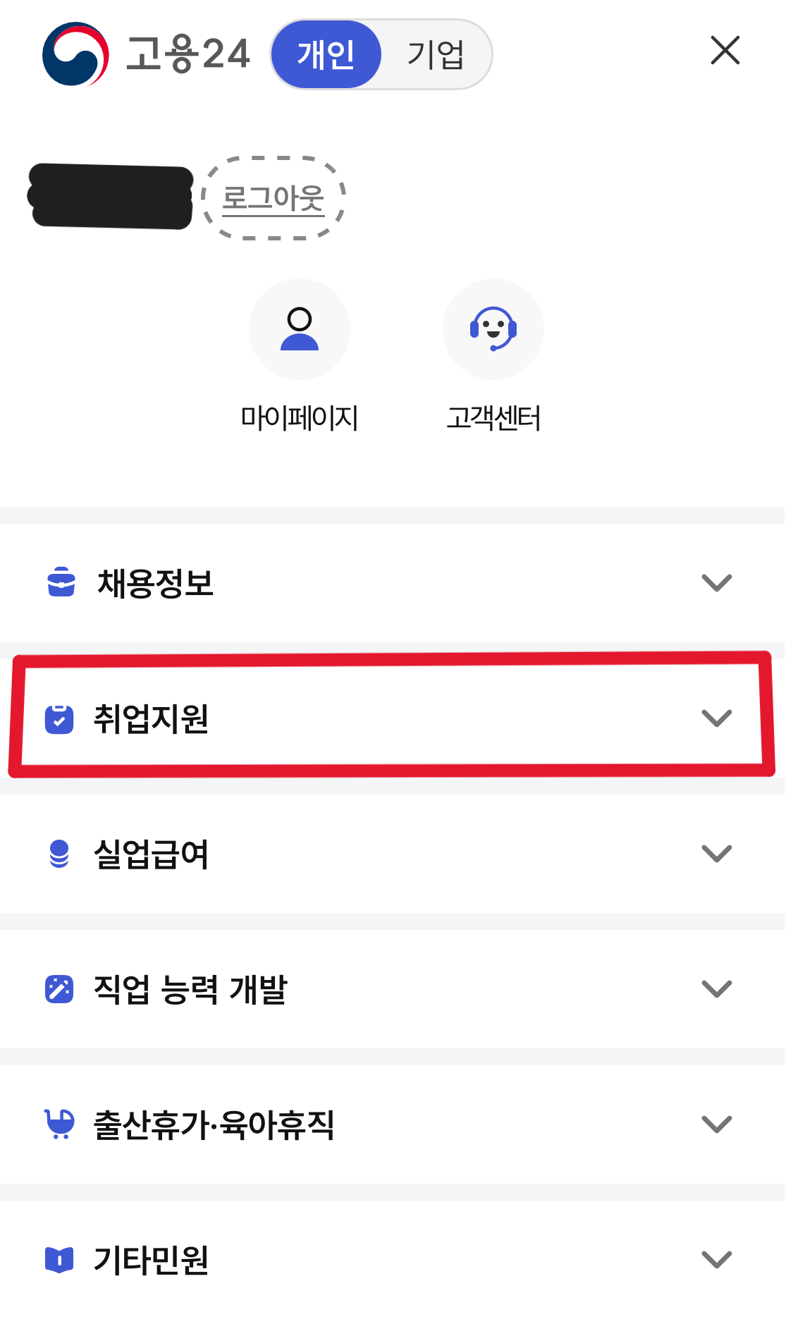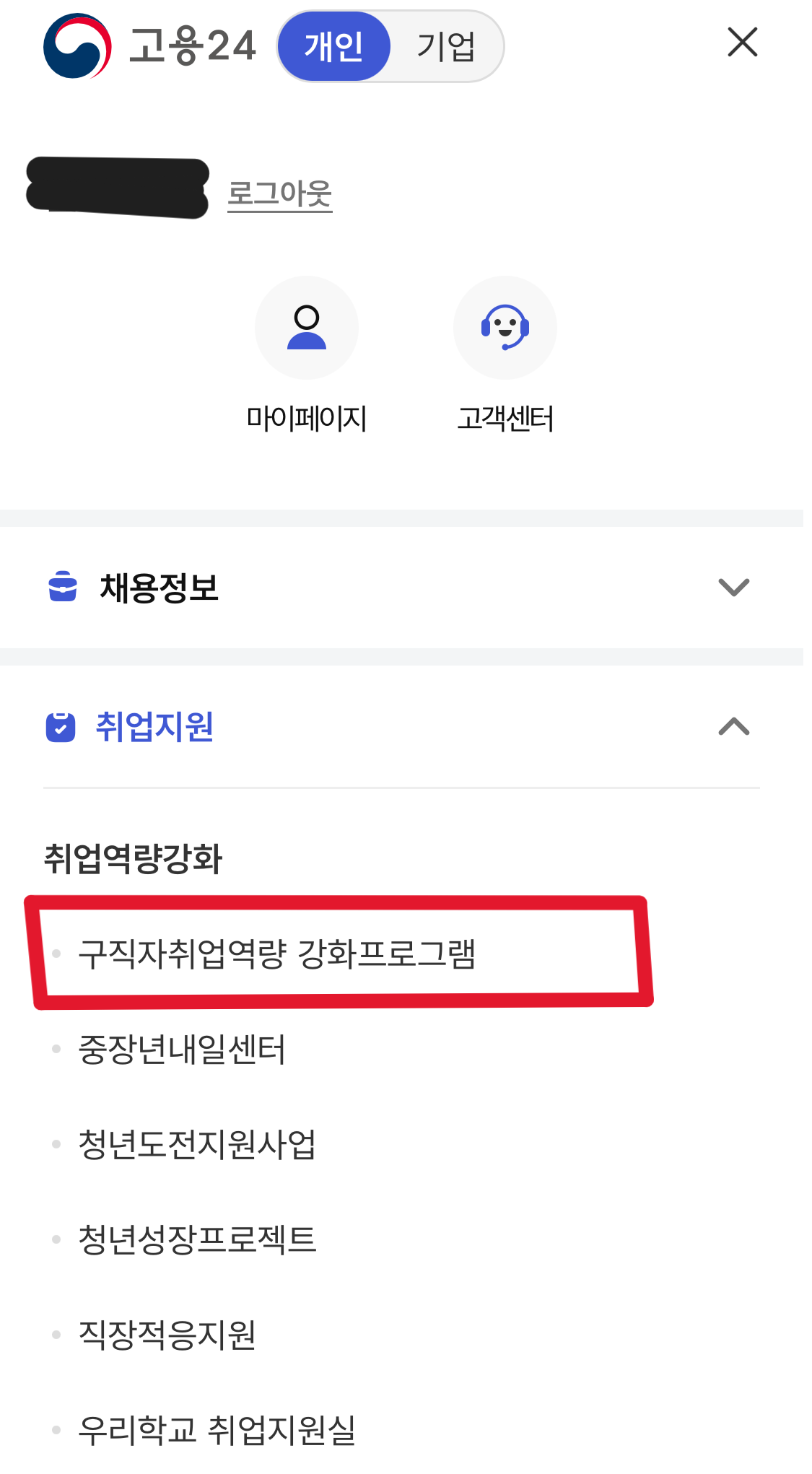 고용센터 신청방법은 '취업지원' 선택 후 '구직자취업역량 강화프로그램'에 들어갑니다.