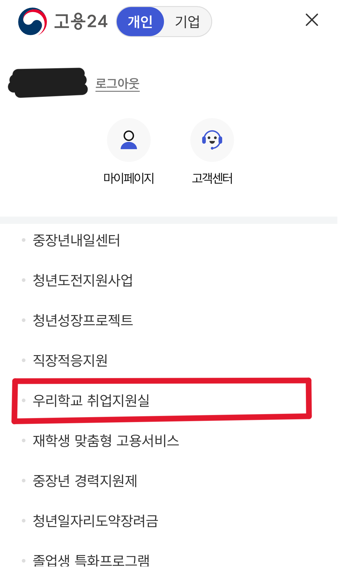 다음으로 우측 상단에 전체메뉴를 들어가서 '취업지원', '우리학교 취업지원실' 순서로 들어갑니다.